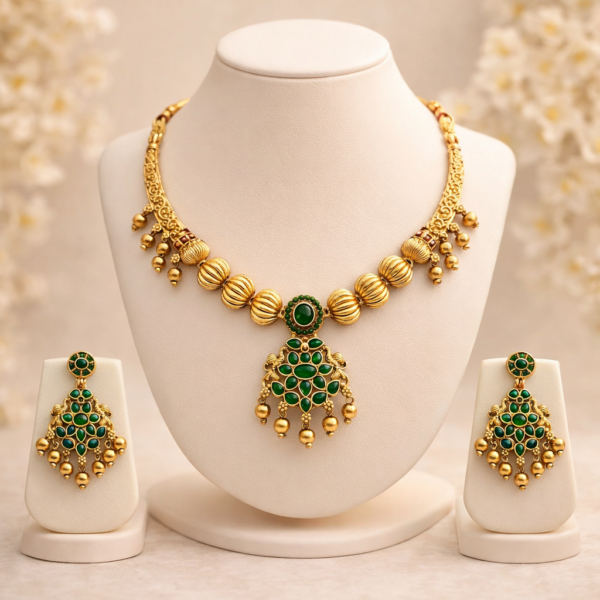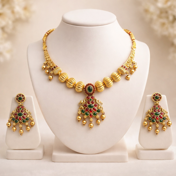Enhance your traditional look with this South Indian Matte Finish Gold Plated Necklace Set, beautifully crafted to reflect the elegance of temple jewellery. The necklace features intricate detailing with decorative gold beads and a stunning pendant design accented with vibrant stones.