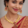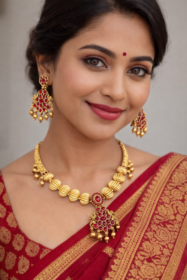 The matte gold finish gives the jewellery a rich and authentic South Indian temple style appearance. Paired with matching earrings, this set perfectly complements traditional outfits like sarees, lehengas, and ethnic dresses.