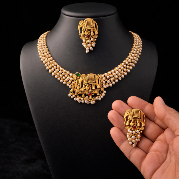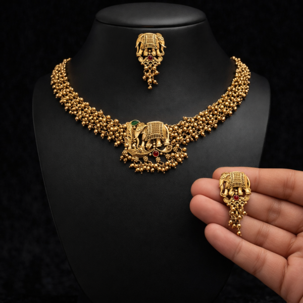 South Indian Temple Elephant Necklace Set for Women – Matte Finish Bridal Choker with Earrings