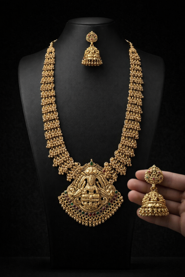 Elegant South Indian temple jewellery long haram necklace set featuring Goddess Lakshmi pendant with matching traditional jhumka earrings. Perfect for bridal wear, weddings, and festive occasions.