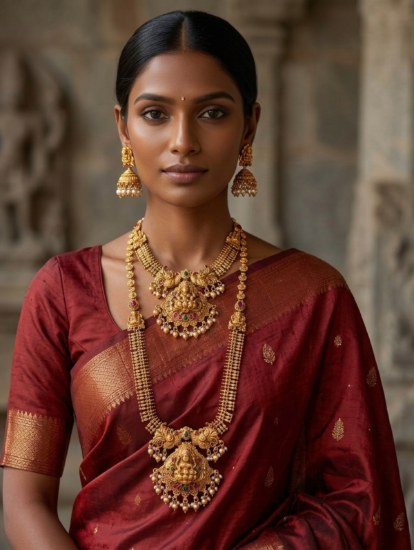 The long haram design adds grandeur while the shorter necklace enhances the neckline beautifully. Matching temple jhumka earrings complete the royal look.