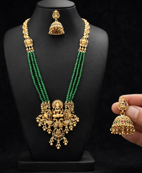 Enhance your traditional look with this exquisite South Indian Temple Jewellery Long Haram Necklace Set, beautifully crafted with intricate temple-inspired detailing. This premium gold-plated necklace features multiple strands of rich green beads, gracefully connected to a majestic Lakshmi pendant symbolizing prosperity and blessings.