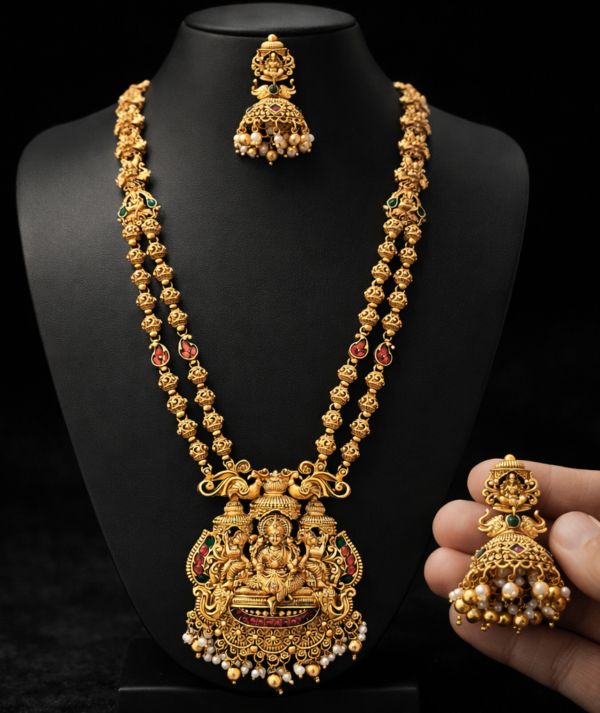 The long dual-layer haram chain is adorned with traditional gold beads and red-green stone accents, giving a rich antique finish. The intricate temple carvings and royal detailing make it ideal for brides and festive occasions.