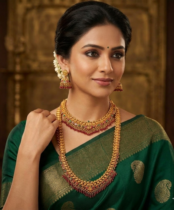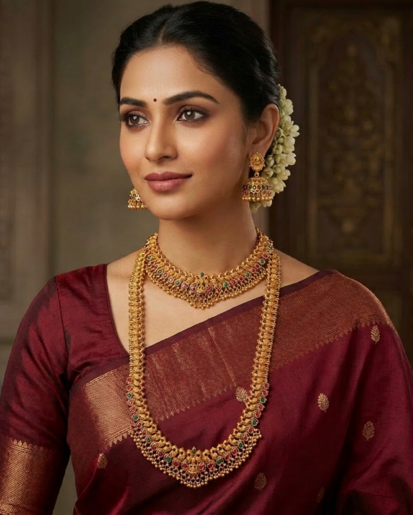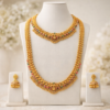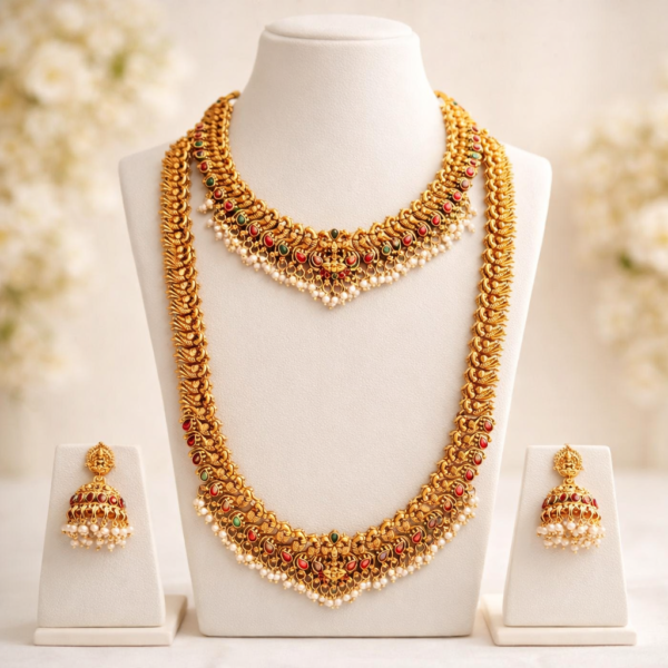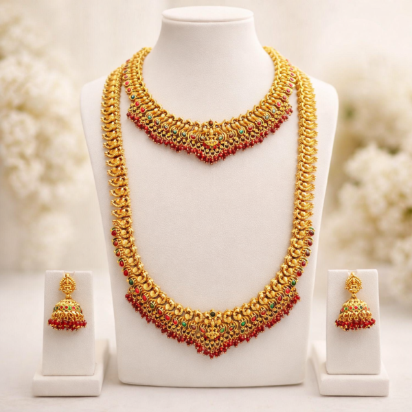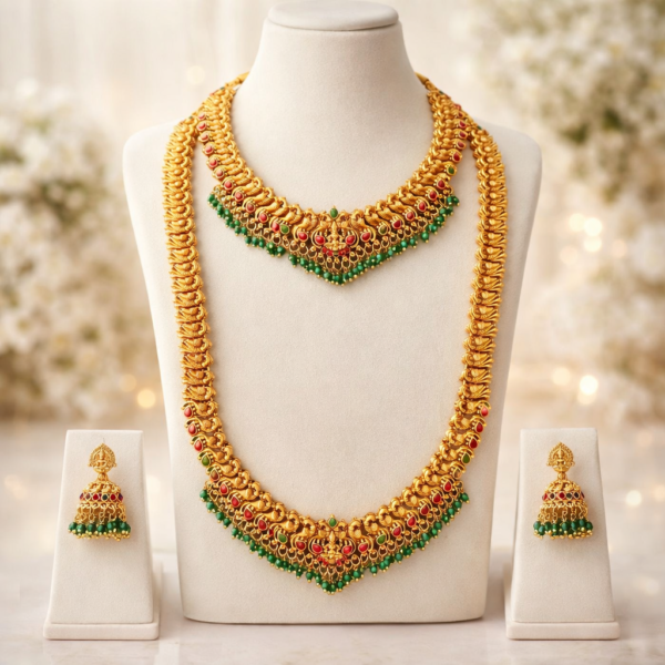 This beautiful jewellery set features a grand long haram necklace paired with a matching short necklace and traditional jhumka earrings, creating a complete bridal jewellery look. The elegant matte gold finish with detailed temple-inspired patterns gives the set a rich and authentic South Indian traditional appearance.