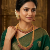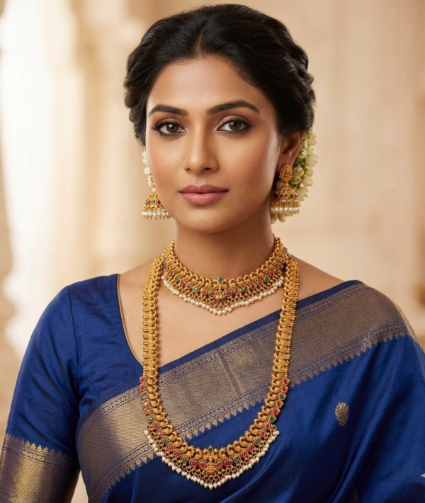 The necklace is decorated with carefully placed stones and bead detailing that enhances the luxurious look while maintaining traditional elegance. The design is inspired by heritage temple jewellery worn during South Indian weddings, festivals, cultural ceremonies, and special occasions.
