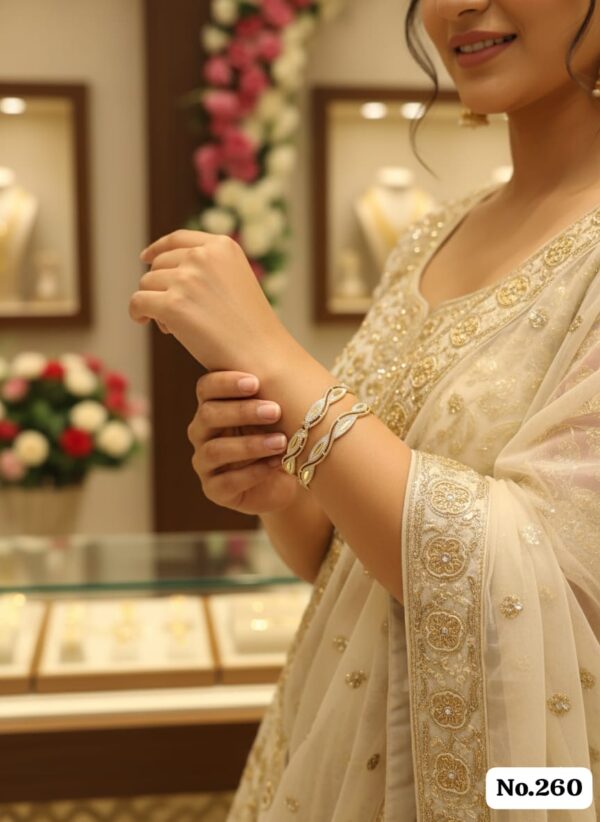 Lightweight yet striking, these bangles are perfect for complementing Indian ethnic wear like suits and sarees, or for adding a touch of sophisticated glamour to Western formal attire. A versatile choice for weddings, engagements, or festive gatherings.