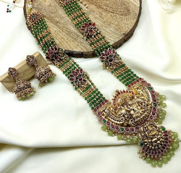 Be the first to review “Temple‑Style Green Beaded Pearl Haram with Goddess Lakshmi Pendant & Matching Jhumkas”