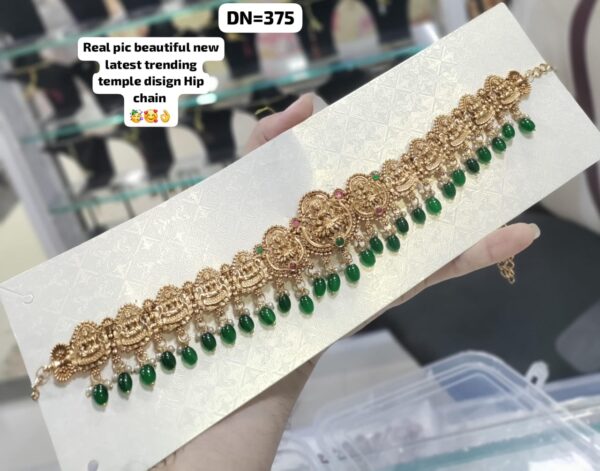 Add a royal touch to your traditional attire with this beautifully designed gold-plated temple-style kamarbandh (waist belt). The hip chain is adorned with Lakshmi motifs and green hanging beads, giving it an exquisite look suitable for bridal wear, classical dance performances, festive functions, and temple visits. Durable, elegant, and adjustable — a must-have ethnic jewelry piece for every woman.