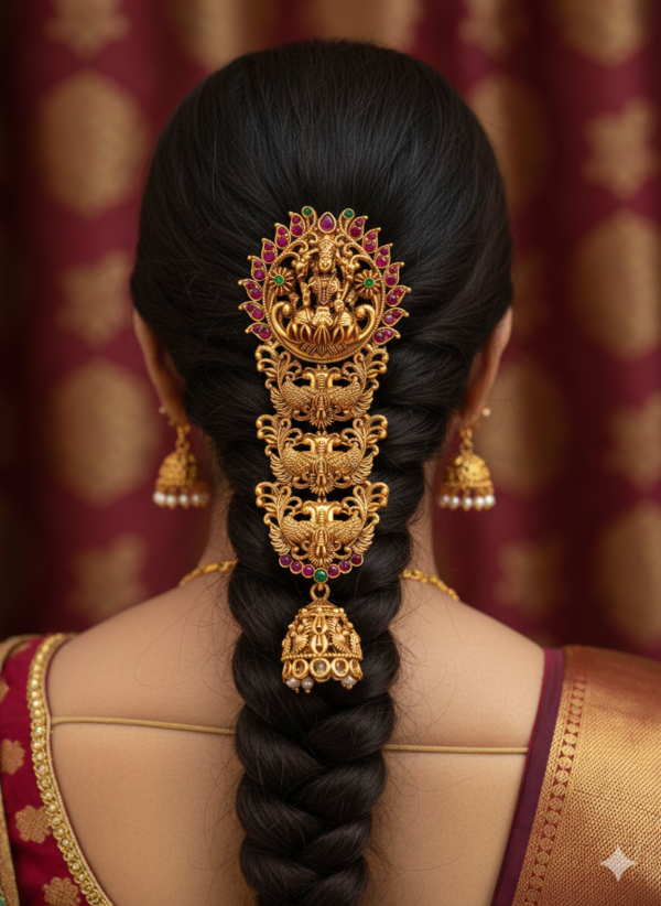 • Exquisite Design: Features a divine Goddess Lakshmi motif at the top, followed by intricate peacock (annapakshi) carvings and a dangling Jhumka bell with pearl detailing.