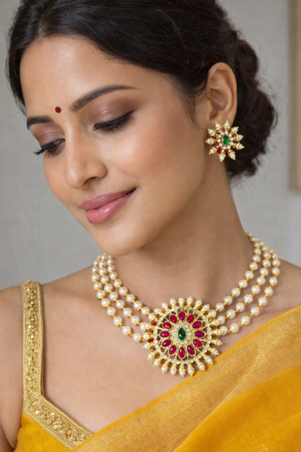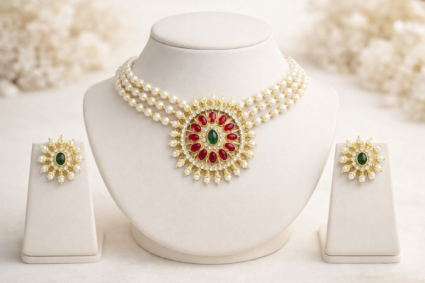 The centerpiece showcases rich red stones arranged in a floral pattern with a vibrant green center stone, surrounded by sparkling kundan crystals and finished with elegant pearl danglings. The multi-layer pearl design creates a graceful choker style that sits beautifully around the neckline.