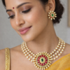 Enhance your traditional look with this stunning 3 Line Pearl Kundan Choker Necklace Set, beautifully designed for brides and festive occasions. The necklace features three delicate strands of lustrous pearls connected to a magnificent circular kundan pendant.