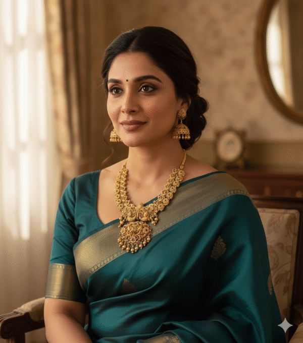 The set is perfectly complemented by a pair of matching traditional Jhumka earrings, which echo the necklace’s antique finish and detailed gold work. This ensemble is ideal for weddings, engagements, traditional festivals, and all grand ethnic gatherings. It pairs flawlessly with silk sarees like Kanjivaram (Kanchipuram) and other traditional Indian attire.