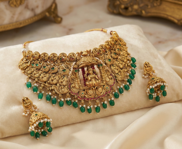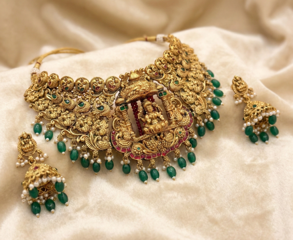 • Exquisite Temple Design: This choker set features a highly detailed central motif of Goddess Lakshmi seated under an arch, flanked by intricate peacock designs, reflecting authentic South Indian temple artistry.