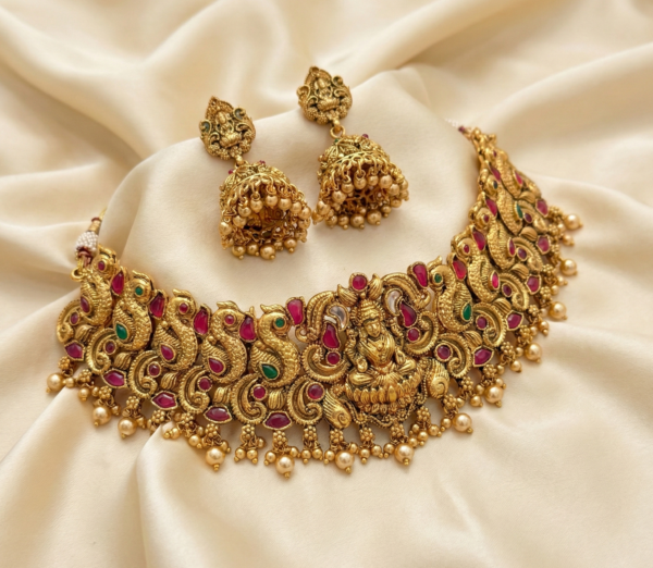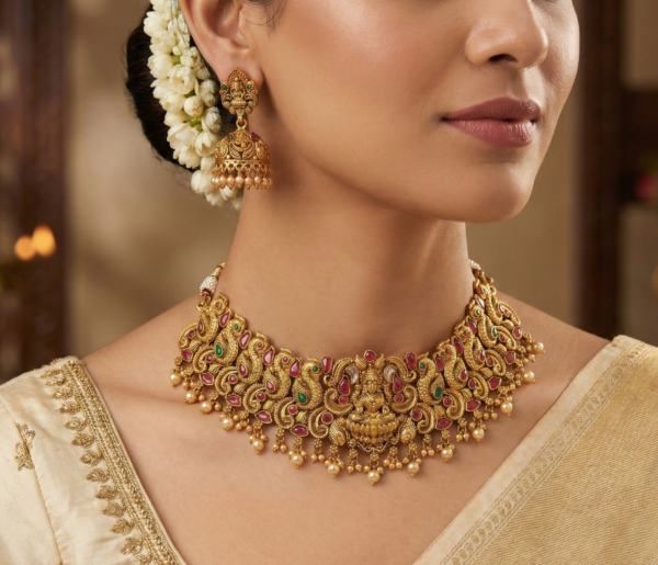 Designed for the modern woman who cherishes tradition, this jewelry set is a masterpiece of South Indian craftsmanship. The choker features a stunning central motif of Goddess Lakshmi, the deity of wealth and prosperity, intricately embossed and surrounded by graceful peacocks. The intricate metalwork is highlighted by the rich, deep tones of an antique matte gold finish, giving it the allure of an heirloom piece passed down through generations.