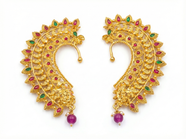 • Exquisite Design: Features intricate gold-plated filigree work with classic paisley (mango) motifs and leaf patterns, designed to hug the curvature of the ear for a royal look.