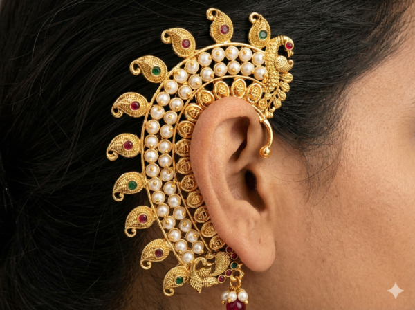 • Exquisite Design: Features a stunning traditional “Bahubali” style full ear cuff design with intricate peacock and paisley motifs, adorned with high-quality artificial pearls and red/green stones.