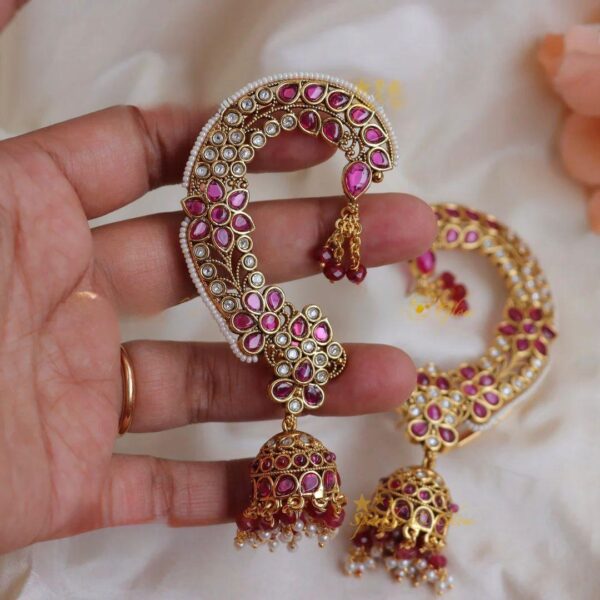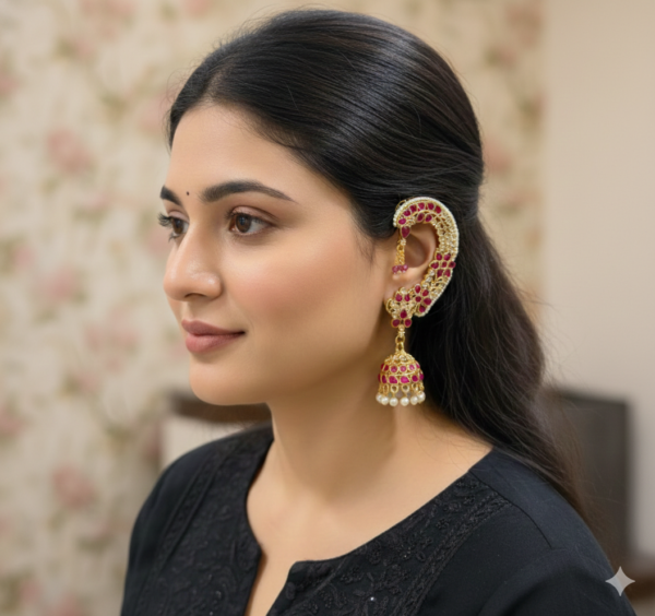 Designed for the modern woman who loves to stay rooted in tradition, these earrings are a masterpiece of craftsmanship. The design features a unique “ear cuff” structure that gracefully curves up the ear, adorned with vibrant ruby-colored stones and dazzling white accents that mimic the look of real Kundan and Polki work.