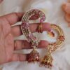 The outer edge is lined with small, lustrous white pearls that add a touch of softness to the bold design. The centerpiece is the classic bell-shaped Jhumka hanging at the bottom, finished with hanging pearl clusters that sway with every movement.