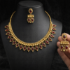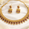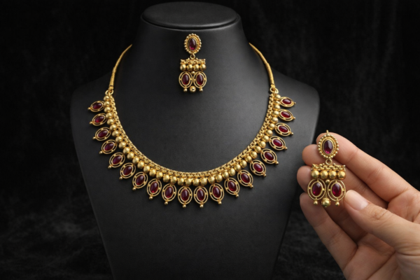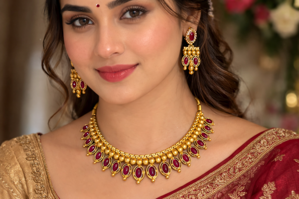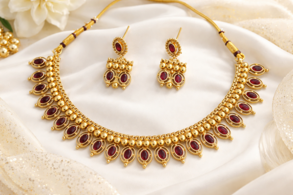 The warm gold tone combined with deep ruby accents makes this piece versatile for pairing with sarees, lehengas, gowns, and traditional outfits. Whether you’re attending a wedding or celebrating a festival, this necklace set brings out a refined and elegant style.