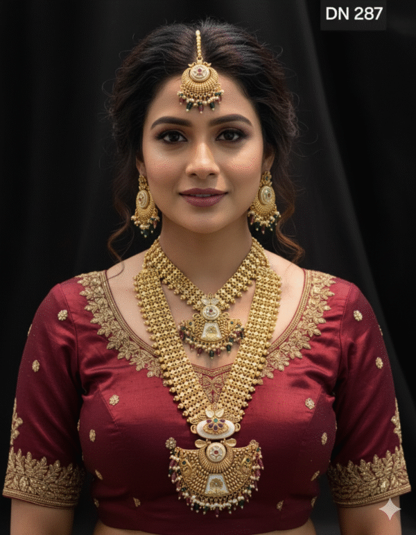 Adorn yourself with this stunning traditional semi-bridal jewelry set, perfect for weddings, engagements, and festive occasions. The set features two layers of intricately designed, gold-plated necklaces: a choker and a long layered chain, both featuring temple-style craftsmanship and delicate green and red stone accents. The ensemble is completed with matching jhumka earrings and a beautiful maang tikka. The heavy, yet elegant design captures the essence of classic South Indian bridal wear (e.g., guttapusalu, antique finish). An ideal choice for brides, bridesmaids, or anyone seeking a grand, ethnic look.