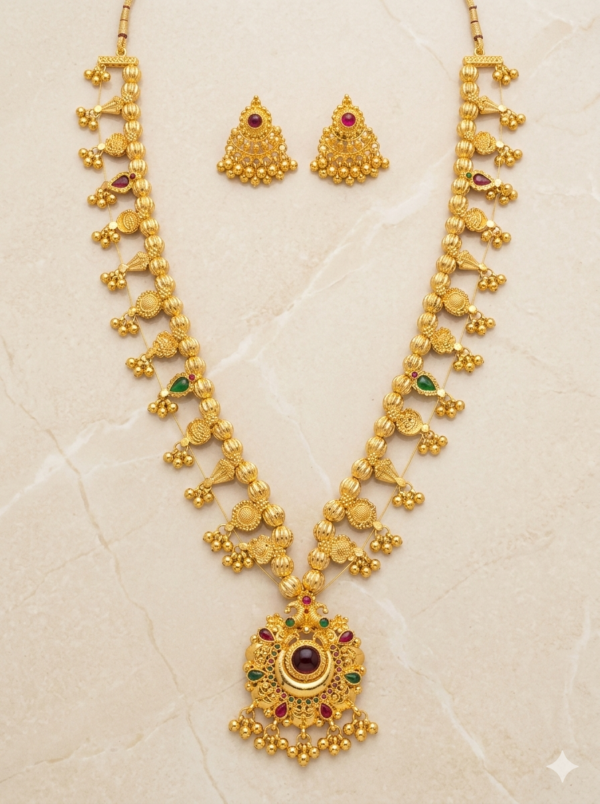 This particular set features meticulously crafted gold-toned beads (javamani) interspersed with traditional “panadi” elements. The centerpiece is a magnificent circular pendant inspired by temple architecture, featuring a bold ruby-colored stone surrounded by delicate floral filigree and green accents.