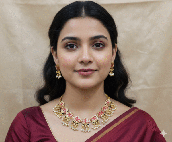 Be the first to review “Traditional Lotus Choker Necklace Set with Pink Enamel, Dangling Pearl Drops & Matching Earrings”