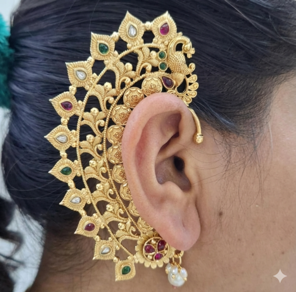 Step into the spotlight with these exquisite Traditional Peacock Ear Cuffs, designed to bring the grandeur of royal heritage to your jewelry collection. Often known as “Bahubali” earrings or “Kaan Phool,” these ear cuffs cover the entire ear rim, creating a bold and beautiful statement.