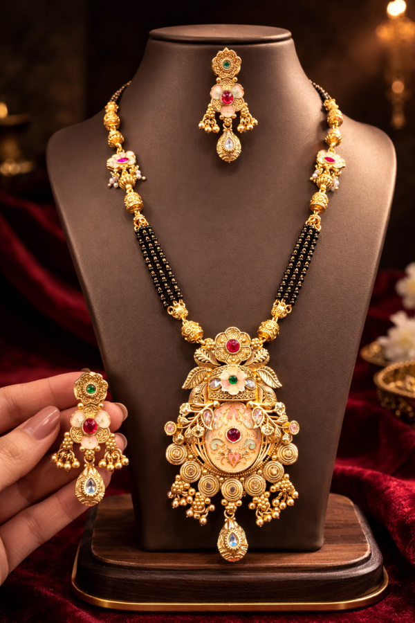 Elevate your ethnic ensemble with this meticulously crafted Rajwadi Mangalsutra Set. Blending traditional heritage with contemporary elegance, this set is designed to make a statement. The centerpiece features a grand, ornate pendant decorated with vibrant Meenakari work and subtle stone embellishments, suspended from a classic triple-strand black bead chain—a symbol of enduring marital bliss.