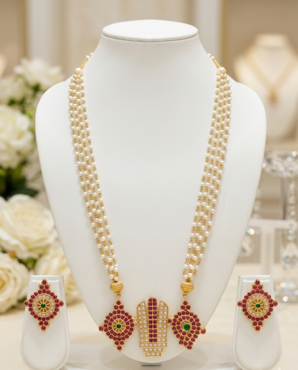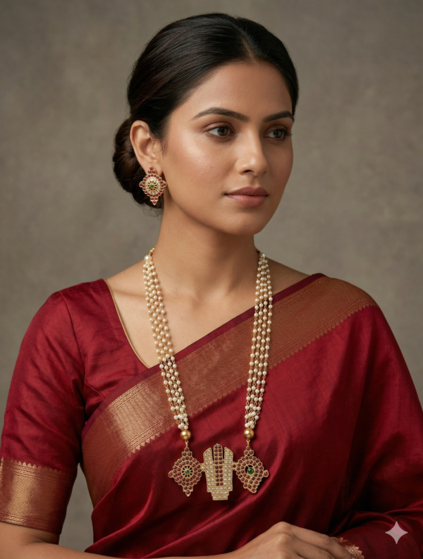 Beautiful traditional long pearl necklace set featuring a Shankh Chakra Tilak pendant design with red and green stones. Crafted with gold polish and multi-layer pearl beads, this fashion jewellery set comes with matching stud earrings and is perfect for festive, traditional, and temple wear. This product is fashion jewellery with Matte gold polish and not real gold jewellery. The quality and finishing are designed according to its affordable price category.