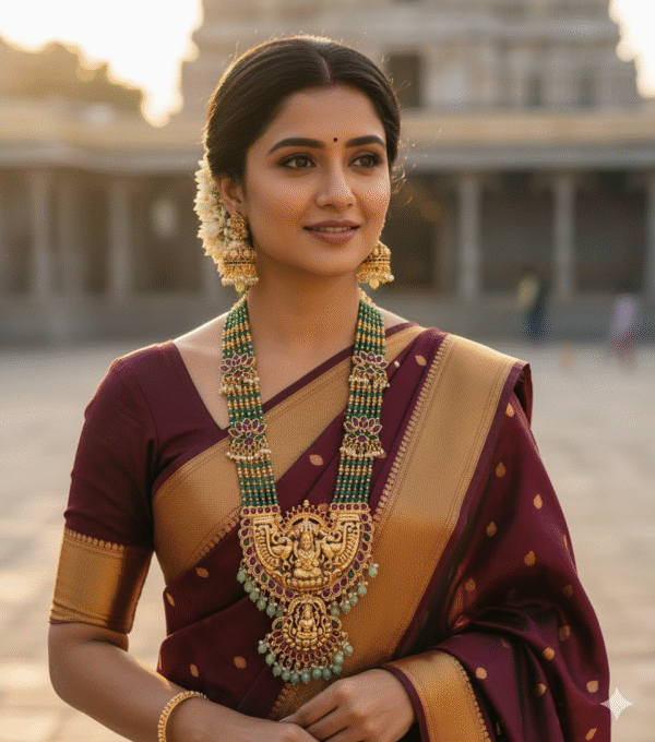 Embrace tradition with this luxurious, gold-plated long necklace (Haar/Haaram) and matching Jhumka earrings. This striking set features multiple strands of deep emerald green beads, interspersed with floral motifs studded with vibrant ruby-red stones. The centerpiece is a magnificent, intricate gold-plated pendant depicting a Goddess (likely Laxmi/Devi), adorned with dangling green beads. The set is completed with large, detailed Jhumka earrings that perfectly complement the necklace’s design. This heirloom-quality piece is a statement accessory, perfect for bridal wear, grand occasions, festivals, and pairing with Kanjivaram or silk sarees.