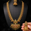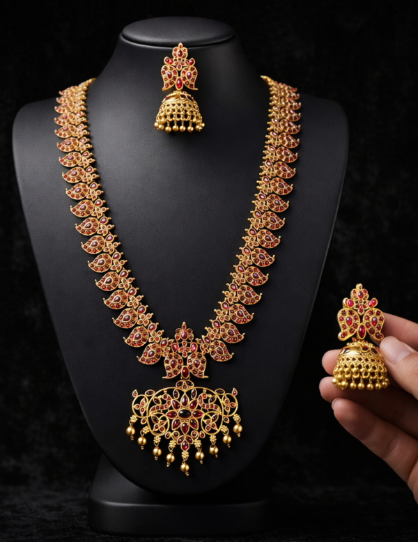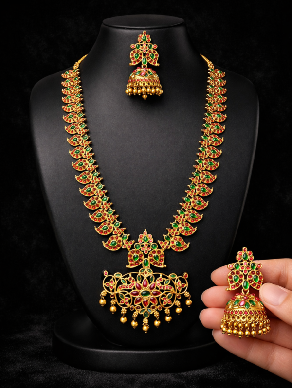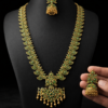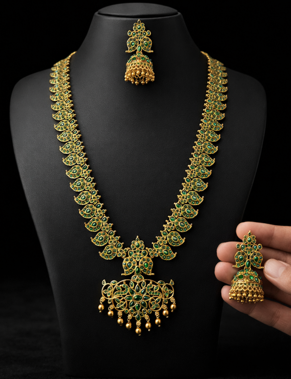 Embrace the timeless elegance of South Indian heritage with our Traditional Temple Long Haram Necklace Set. Inspired by the divine jewelry seen in ancient Indian temples, this set is a masterpiece of artistry and devotion.