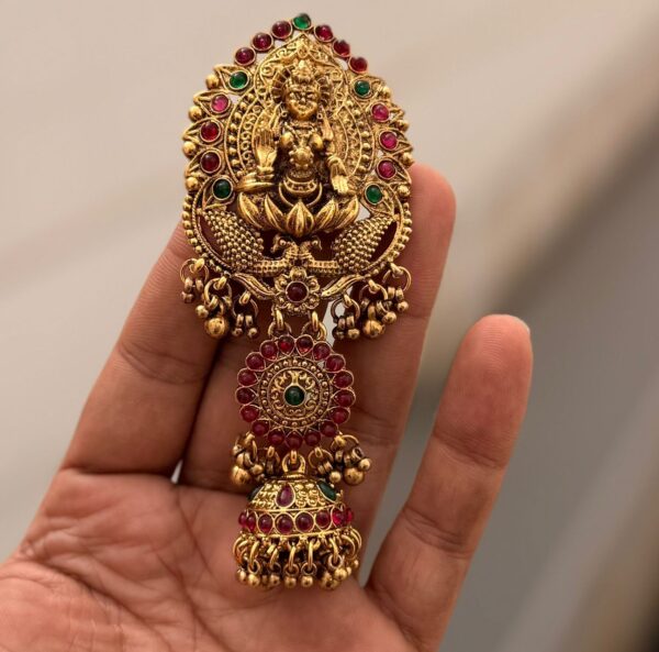 Be the first to review “Traditional South Indian Temple Jewellery Matte Gold Goddess Lakshmi Amboda Hair Pin / Juda Bun Clip with Jhumka & Kemp Stones for Women & Brides (Red & Green)”