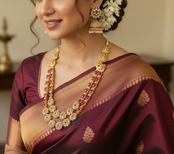 Bring elegance and tradition to your special occasions with this beautifully crafted South Indian Temple Jewelry Long Haram Set, featuring intricate floral motifs and pink stone embellishments. The double-layered haram is gold-plated and adorned with sparkling cubic zirconia and ruby-colored stones, giving it a rich and regal appearance. Paired with matching heavy jhumka earrings and a maang tikka, this set is ideal for brides, bridesmaids, or festive wear. A perfect match for silk sarees and ethnic outfits, this jewelry set blends heritage charm with contemporary elegance.