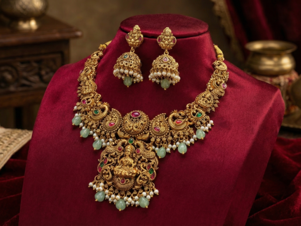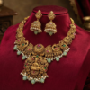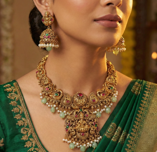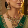 Embrace the timeless elegance of heritage with this Divine Lakshmi Temple Jewelry Set. Inspired by the architectural grandeur of South Indian temples, this set is designed for the woman who appreciates the fusion of spirituality and style.