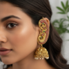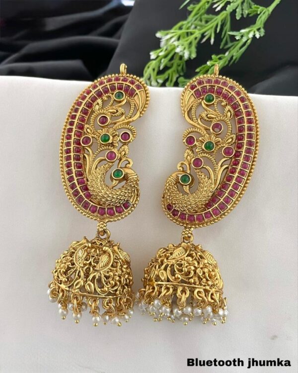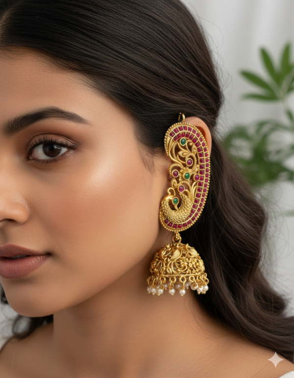 Elevate your ethnic ensemble with these breathtaking Peacock Motif Ear-Cuff Jhumkas. Meticulously crafted to mirror the grandeur of traditional Indian temple jewelry, these earrings feature a sweeping ear-cuff (Kaan-Chain style) that beautifully contours the outer ear.